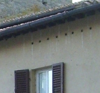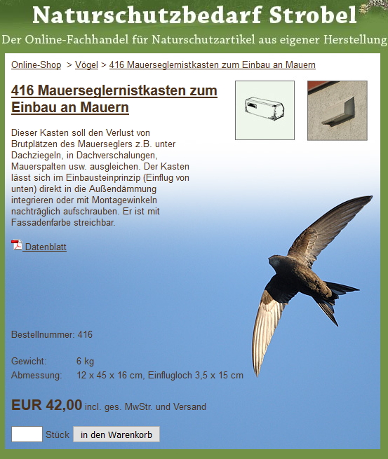 Mauersegler verschmutzen die Fassade nicht! Unkenntnis führt oft bei Bauherren zum Verbot von Nistkästen. Fassaden mit Mehlschwalbennestern (leicht zu erkennen an ihren Lehmnestern) sind leider oft sehr verkotet. |