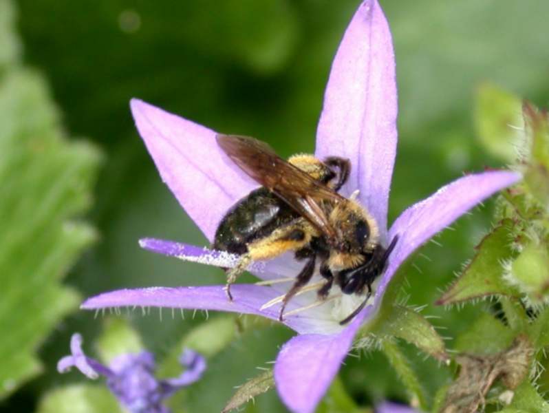 Rechts: Eine Sandbiene [Andrena sp.] auf Campanulablüte |