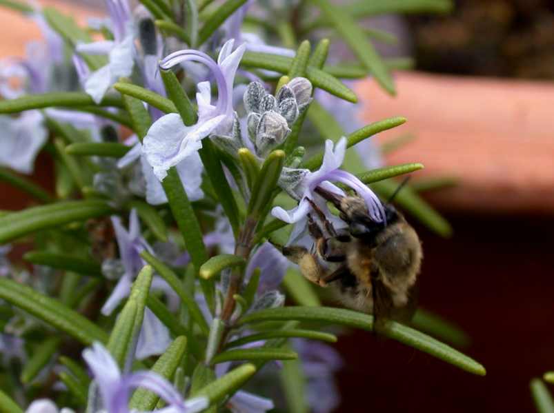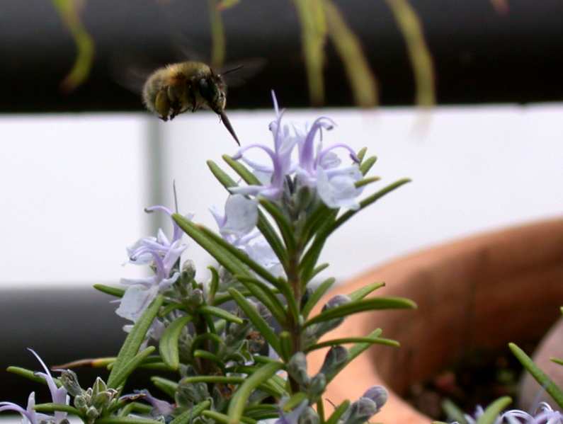 und rechts: Die Pelzbiene [Anthophora plumipes] liebt die Blüten des Rosmarin. |