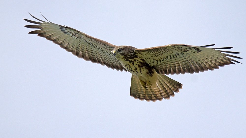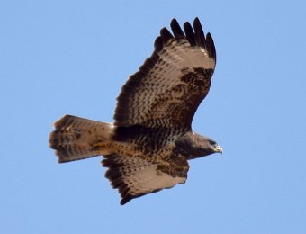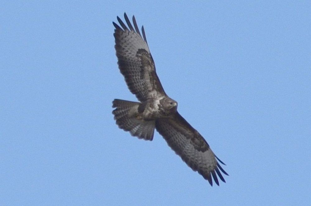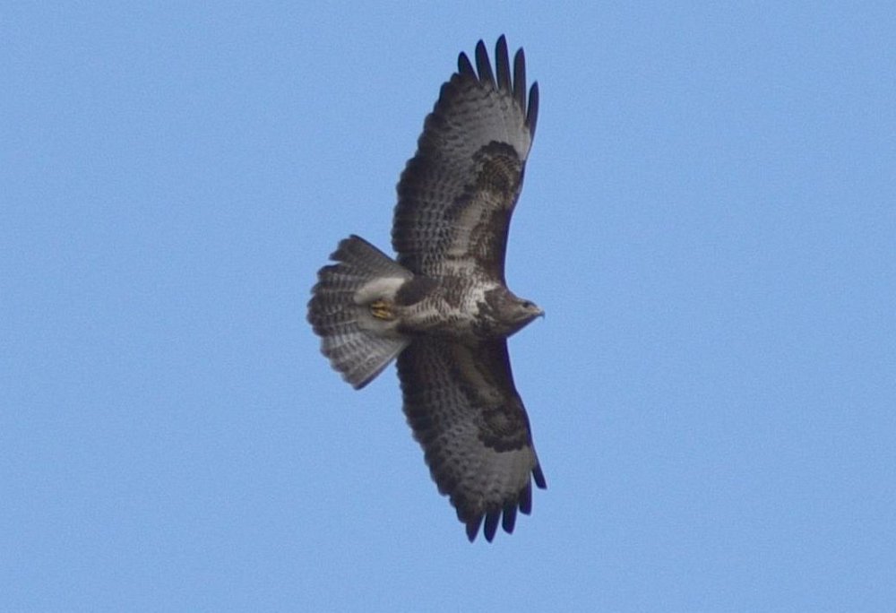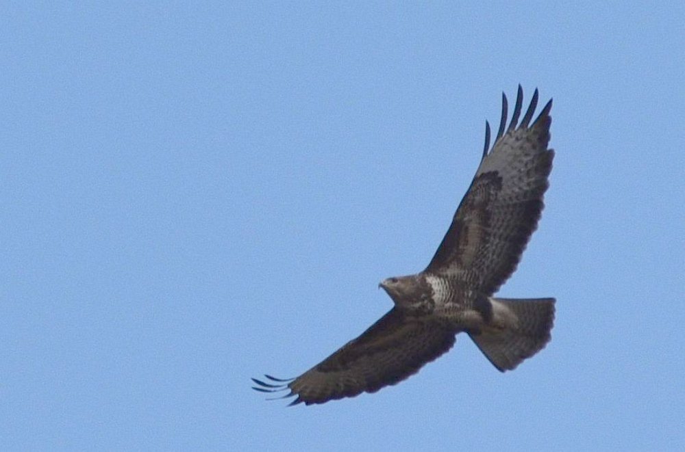 Nahaufnahmen von fliegenden Mäusebussarden (Buteo buteo) mit unterschiedlicher Gefiederfärbung: die meisten sind grau, beige und braun aber auch einige mit fast weißem Federkleid (helle Morphe). Entdeckt und fotografiert im Havelland und in der Uckermark. Man trifft sie bei uns ganzjährig an, während Milane, Fischadler und andere Greifvögel im Herbst wegziehen. Ein Wespenbussard ist als Zufallsentdeckung auch dabei.