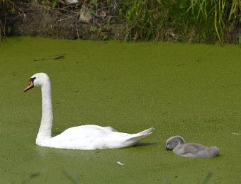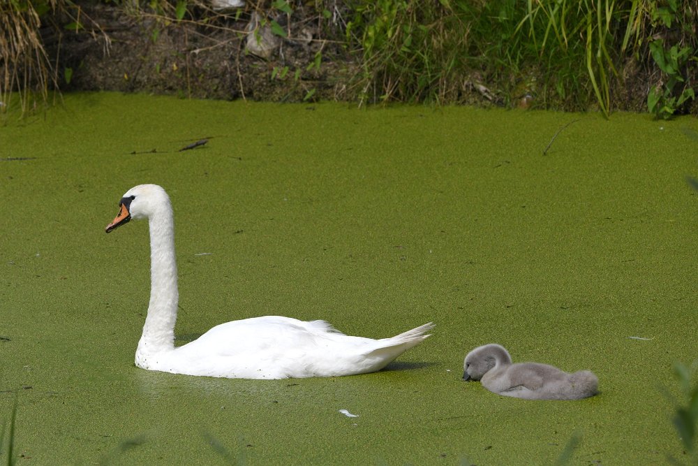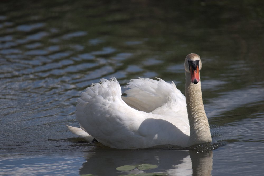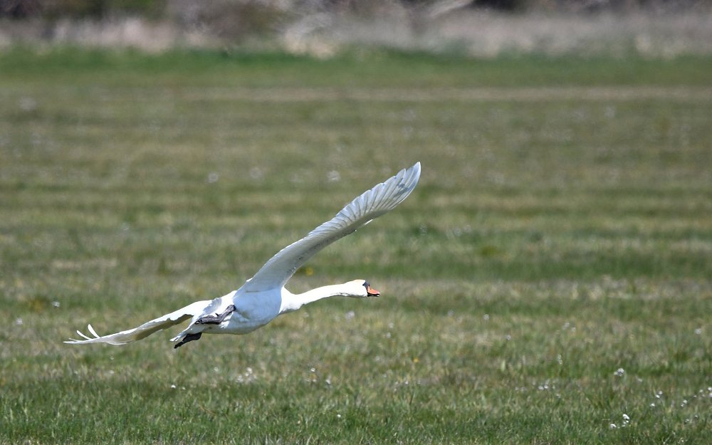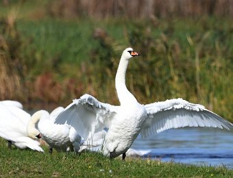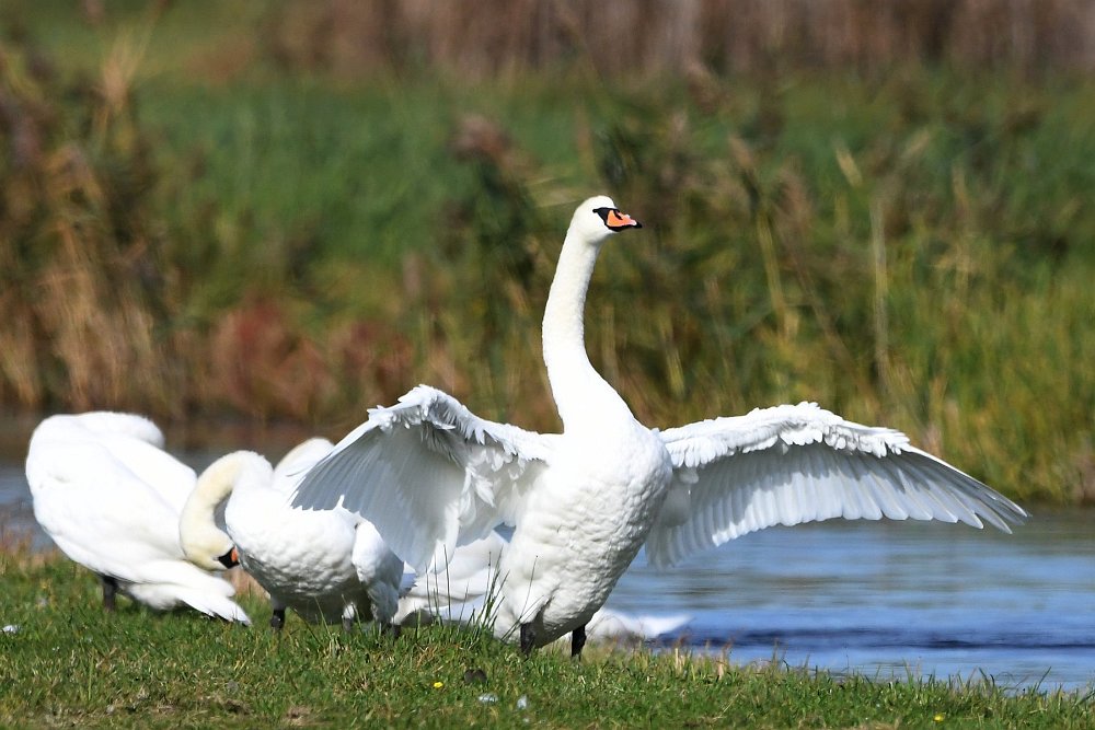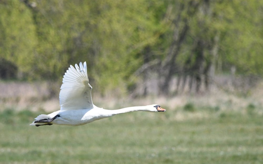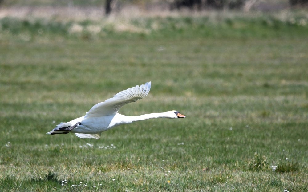 Höcker- und Singschwäne auf der Wiese, dem Wasser und in der Luft. Auch diese Vögel leben gesellig und bleiben meist über Winter bei uns. Wenn diese schweren weißen Vögel starten, ist das ein besonderes Schauspiel. In der Luft hört man das Rauschen der Flügelschläge und man hebt unwillkürlich den Kopf um schaut ihnen nachzuschauen.