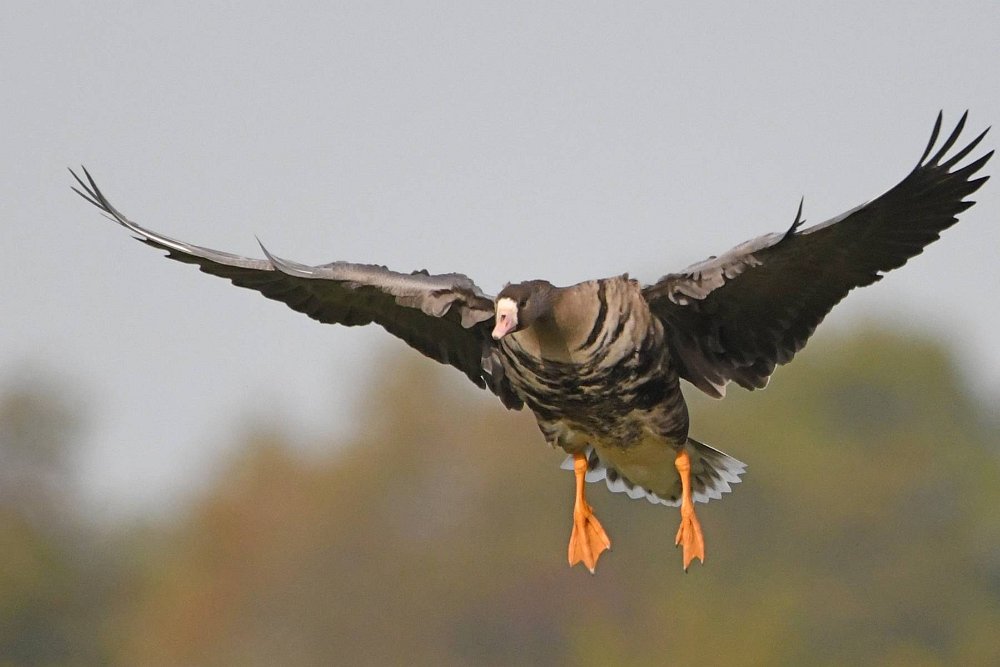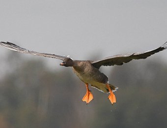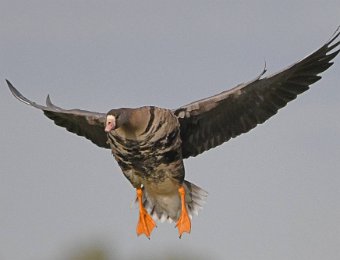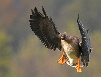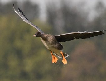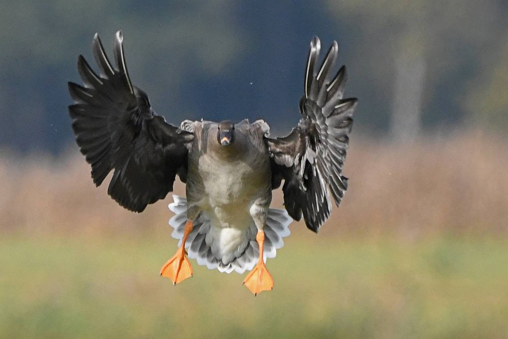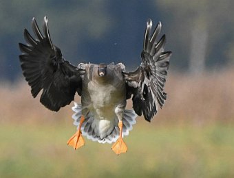 Riesige Ansammlungen von Wildgaensen landen auf einer Feuchtwiese bei Körzin. Es handelt sich um Graugaense, Saat- und Blessgaense. Ich hatte Glück. Die Sonne stand gut und die Gaense flogen direkt auf die Kamera zu. Der Landeanflug der Voegel sieht sehr lustig aus.