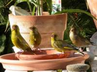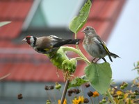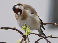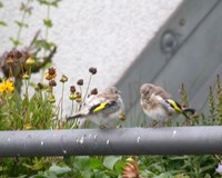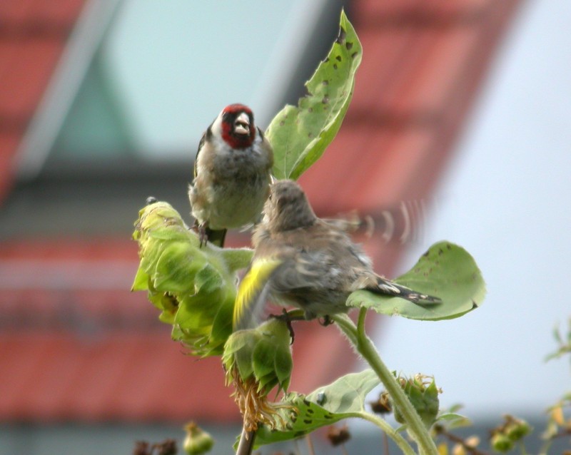 satte Stieglitzküken nach der Fütterung durch den Altvogel