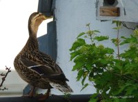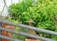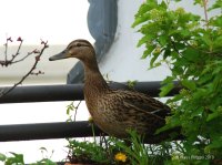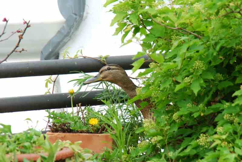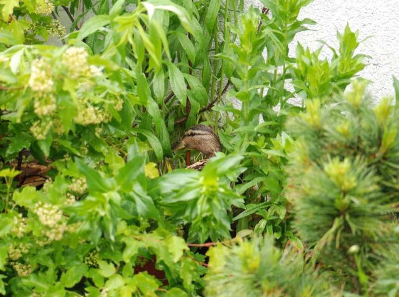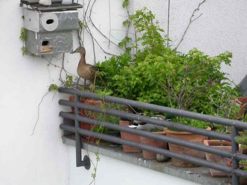 und Mauersegler brüten im Nistkasten - Die Stockente Konstanze brütet versteckt hinter Grün im Pflanzkübel |