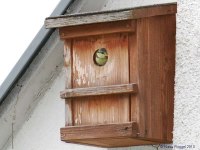 Das erste Junge, dem ich zuschauen konnte, macht einen gekonnten Satz und landet fast im Einflugloch eines Mauerseglerkastens gegenüber und segelt jedoch hinunter in die Kastanie im Hof. Der aufmerksame Altvogel fliegt gleich hinterher und nimmt es in seine Obhut. |