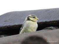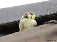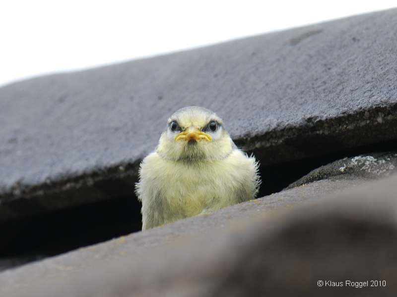 Unter einem Firstziegel ist die junge Blaumeise erstmal in Sicherheit. | Die