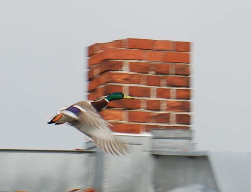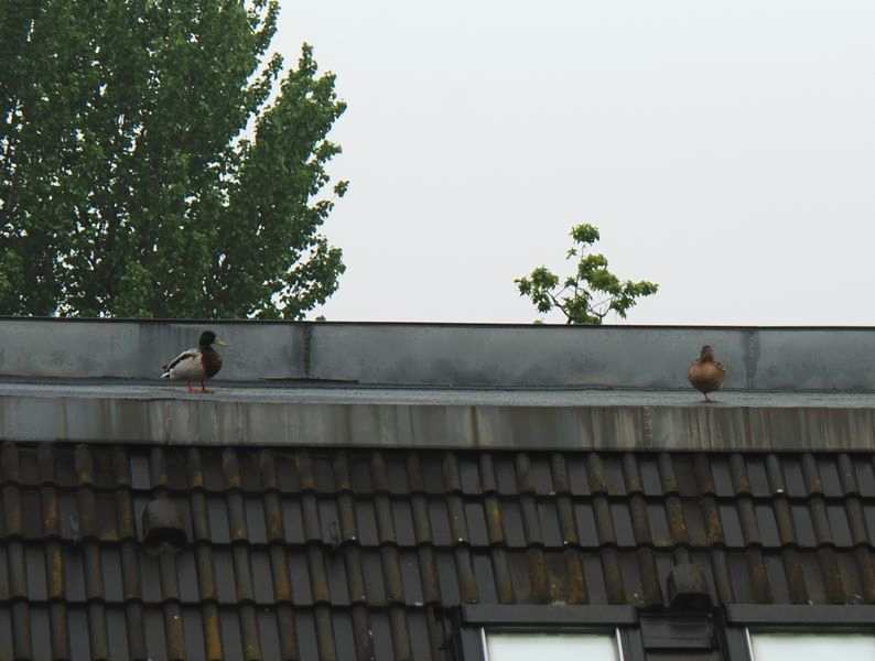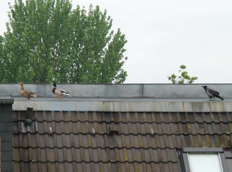 Als ich es am nächsten Morgen um 6 Uhr im Bett nicht mehr aushielt, saß Erpelmann Konstantin auf dem gegenüber liegenden Dach und schaute sich die Augen aus nach seiner Angebeteten. Sie ließ den Herrn Gemahl erst mal eine Weile warten. Um 6:22 Uhr geruhte sie sich in gebührendem Abstand neben ihm nieder zu lassen. Oft schaute er verstohlen zu ihr herüber. Auf einem Bein stehend schaute sie gelangweilt gerade aus. Eine stoische Ruhe ging von ihr aus. Worauf wartete sie? Ich hatte mich zwar gezeigt aber zurückhaltend im Wohnzimmer Posten bezogen. | |