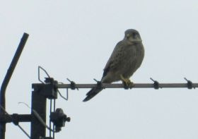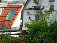 Das zweite Junge fliegt in die andere Richtung an mir vorbei auf das Dach über mir. Vom Galeriefenster aus kann ich es sehen, zum Greifen nahe. Nur schnell ein paar Fotos und schon fliegt es hoch hinauf zu einem Schornstein und dann weiter zum Nachbarhaus. Wie soll ihn jetzt der Altvogel finden? |