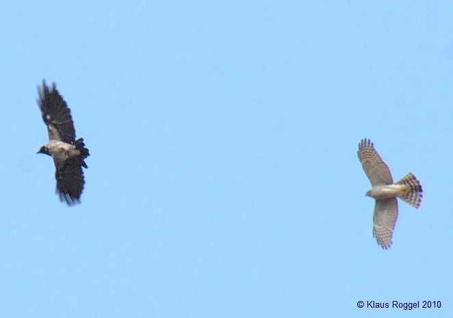 den Habicht an und dann der Habicht die Krähe. In der Fotoserie scheint der Greifvogel der Angreifer zu sein. Aber im nächsten Moment greift die Krähe den Habicht an. Es geht mehrmals hin und her. |